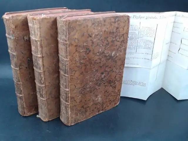 Tome premier, second et troisieme / Band 1, 2 und 3. XXXII, 370, 516, 508 S., 1 Faltplan (Métaphysique des Corps au Physique générale. De l`Etendue, de l´Impénétrabilité...) 8° (=18,5-22,5cm), Ledereinband mit Goldprägung auf dem Rücken, Farbschnitt.