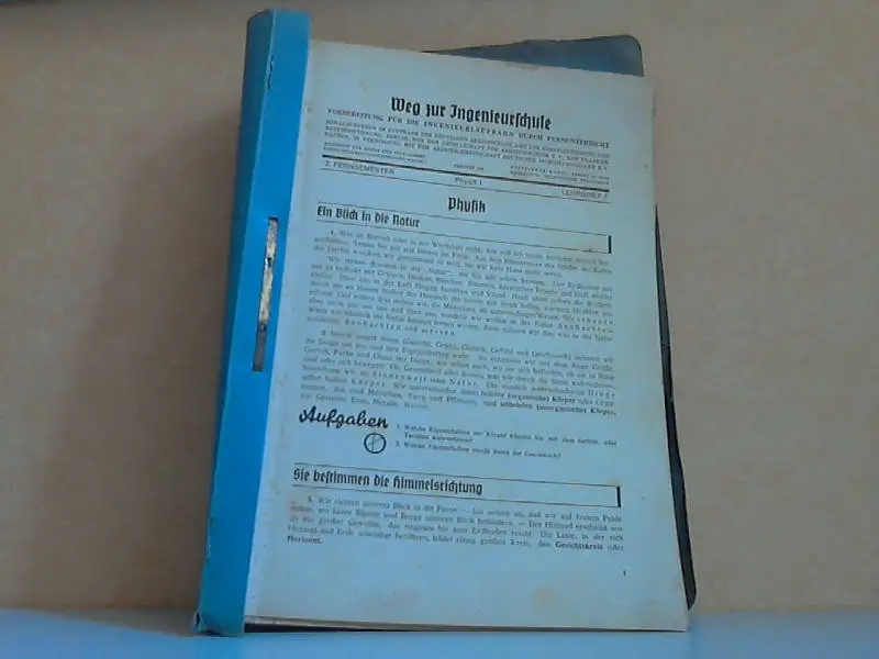 das Erscheinungsjahr ist geschätzt, diese Blätter sind ein Dachbodenfund, stark gebräunt und fleckig, Hefterkanten mit Bestoßungen, aus dem Inhalt: PHYSIK: LEHRBRIEF 1: Ein Blick in die Natur - Sie bestimmen die Himmelsrichtung - Der Polarstern - Unser Planetensystem LEHRBRIEF 2: Die Ganzheit - Die Erde - Naturwissenschaften - Beherrsche die Naturgesetze! - Messen und Maße LEHRBRIEF 3: Versuche - Ein Körper erfüllt einen Raum, Das Volumen - Ein Körper ist teilbar, Das Molekül - Was hält die Moleküle eines Körpers zusammen ?, Die Kohäsion - Was hält die Kreide an der Tafel fest?, Die Adhäsion - Die Aggregatzustände - Verschiedene Arten fester Körper - Das Gesetz von Hooke LEHRBRIEF 4: Ein Körper ist schwer, Das Gewicht - 1 dm* Wasser wiegt 1 kg, Die Wichte - Wieviel wiegt Luft? - Die zeichnerische Darstellung einer Kraft LEHRBRIEF 5: Der Druck - Der Luftdruck - Luftdruckmesser oder Barometer LEHRBRIEF 6: Die Änderung des Luftdrucks zeigt Wetteränderung an - Überdruckmesser oder Manometer - Der Druck auf eine Flüssigkeit LEHRBRIEF 7: Der hydrostatische Druck - Auftrieb LEHRBRIEF 8: Das Gesetz von Archimedes - Wann schwimmt der Körper in einer Flüssigkeit? - Senkwaagen oder Aräometer - Heber LEHRBRIEF 9: Wiederholung LEHRBRIEF 10: Aufgaben zum Leistungsnachweis LEHRBRIEF 11: Pumpen - Wärmelehre - Durch Erwärmen dehnt sich ein Körper aus - Thermometer sind Temperaturmesser LEHRBRIEF 12: Thermometer und Temperaturskalen - Die Längenausdehnung fester Körper durch Wärme - Einige Anwendungen LEHRBRIEF 13: Die Raumausdehnungszahl - Die Ausdehnung des Wassers - Ausdehnung der Gase LEHRBRIEF 14: Die Wärmeeinheit: 1 Kilokalorie - Die spezifische Wärme - Minderung des Aggregatzustands durch Erwärmen - Kleine Plauderei LEHRBRIEF 15: nderung des Aggregatzustandes: Verdampfen u. Verflüssigen - Der Wasserdampf in der Luft: die Luftfeuchtigkeit LEHRBRIEF 16: Wärmeverbrauch oder Wärmegewinn bei Zustandsänderungen - Die Ausbreitung der Wärme LEHRBRIEF 17: Arbeit, Energie und Leistung - Wärme und Arbeit - Wärmequellen - Ruhe und Bewegung LEHRBRIEF 18: Das Trägheitsgesetz - Die gleichförmige Bewegung - Die gleichförmige Drehbewegung LEHRBRIEF 19: Wiederholung - Wiederholungsfragen und Aufgaben - Antworten und Lösungen LEHRBRIEF 20: Aufgaben zum Leistungsnachweis LEHRBRIEF 21: Die Entdeckung des Magnetismus - Natürliche und künstliche Magnete - Sie machen Versuche - Aufbau der Magnete, Molekularmagnete LEHRBRIEF 22: Das magnetische Feld, die Feldlinien - Darstellung einiger Feldbilder - Magnetische Durchlässigkeit, magnetische Leitfähigkeit - Inneres und äußeres Magnetfeld, Kraftlinienrichtung - Die Erde als Magnet - Magnetische Mißweisung, Deklination - Magnetische Neigung, Inklination - Die magnetischen Pole der Erde LEHRBRIEF 23: Kompaß - Versuche und Versuchsgeräte - Elektrizität durch Reibung - Positive und negative elektrische Ladungen - Elektrizilätsmenge - Leiter und Nichtleiter LEHRBRIEF 24: Der elektrische Strom - Stromstärke und Spannung - Widerstand und Leitfähigkeit - Die Stromstärke ist von der Spannung abhängig LEHRBRIEF 25: Die Hintereinanderschaltung von Elementen - Schematische Darstellung einiger Schaltungen - Das Ohmsche Gesetz - Leistung und Arbeit im elektrischen Stromkreis LEHRBRIEF 26: Die Hintereinanderschaltung von Elementen - Schematische Darstellung einiger Schaltungen - Das Ohmsche Gesetz - Leistung und Arbeit im elektrischen Stromkreis LEHRBRIEF 27: Licht- und Wärmewirkungen - Das elektrische Bogenlicht - Elektrische Öfen - Die Widerstandsschweißung - Die Lichtbogenschweißung LEHRBRIEF 28: Die chemischen Wirkungen, Elektrolyse - Die Festlegung der elektrotechnischen Einheiten - Magnetische Wirkungen - Der Elektromagnet LEHRBRIEF 29: Die elektrische Klingel - Der Telegraph oder Fernschreiber - Elektromagnetische Induktion - Der Fernsprecher - Wiederholung LEHRBRIEF 30: Aufgaben zum Leistungsnachweis CHEMIE: LEHRBRIEF 1: Einleitung - Physikalische und chemisches Vorgänge - Chemische Vorgänge, wohin wir blicken LEHRBRIEF 2: Mechanisches Gemenge und chemische Verbindung Die chemische Reaktionswärme - Die chemischen Elemente - Chemische Symbole - Chemische Formeln - Chemische Gleichungen LEHRBRIEF 3: Luft unterhält die Verbrennung - Der Kupferbriefversuch - Beim Verbennen nehmen wir die Metalle an Gewicht zu! - Bei der Verbrennung nimmt das Volumen der Luft ab! - Lösungen LEHRBRIEF 4: Der Luftstickstoff - Der Sauerstoff der Luft - Die pneumatische Wanne - Verbrennungen in reinem Sauerstoff - Lösungen LEHRBRIEF 5: Die Zusammenfassung der Luft - Was ist das Wesen der Verbrennung? - Die langsame Oxydation - Verbrennungsprodukte, Oxyde - Woher stammt der Name "Sauerstoff"? - Aufgaben LEHRBRIEF 6: Die Lösungen der Leichtmetalloxyde in Wasser: Basen - Katalysatoren und Katalyse - Die technische Gewinnung des Sauerstoffs - Das Grundgesetz von der Erhalltung der Masse LEHRBRIEF 7: Zerlegung des Wassers durch glühendes Eisen - Wasser als Verbrennungsprodukt des Wasserstoflfs - Analyse und Synthese - Die Zersetzung des Wassers durch Leichtmetalle LEHRBRIEF 8: Die Zerlegung des Wassers durch den elektrischen Strom - Die technische Gewinnung des Wasserstoffs - Die Darstellung des Wasserstoffs ün Laboratorium - Eigenschaften des Wasserstoffs - Knallgas - Die technische Verwendung des Wasserstoffs - Reduktion und Reduktionsmittel - Das Gesetz der konstanten Gewichtsverhältnisse - Das Gesetz der vielfachen G^wichtsverhältnisse - Die Atomtheorie LEHRBRIEF 9: Wiederholung LEHRBRIEF 10: Aufgaben zum Leistungsnachweis Beschreibung vom Antiquariat Ardelt 4f1a Antiquariat Ardelt