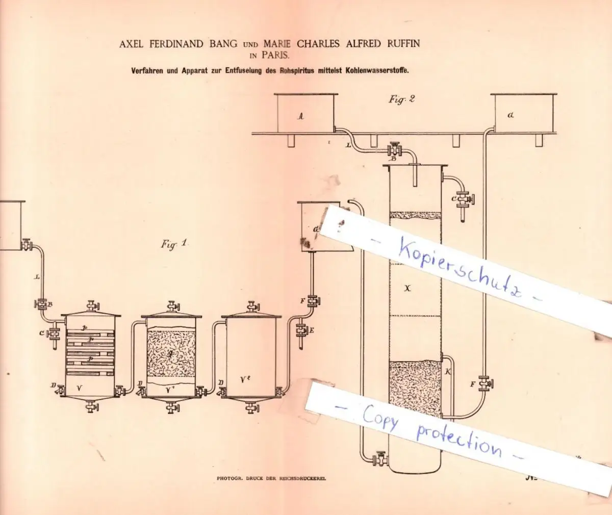 original Patent - A. F. Bang und M. C. A. Ruffin in Paris , 1886 , Apparat zur Entfuselung des Rohspiritus !!!