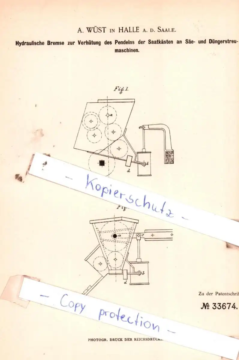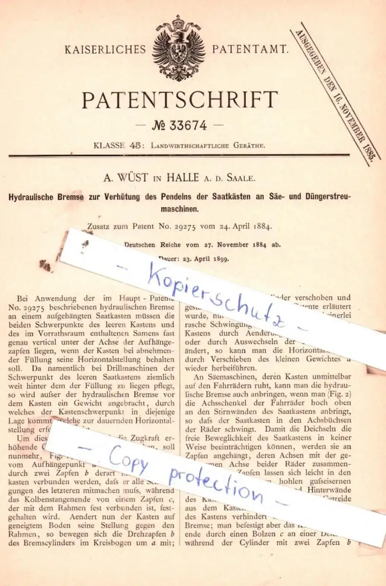 original Patent - A. Wüst in Halle a. d. Saale , 1884 , Landwirthschaftliche Geräthe !!!