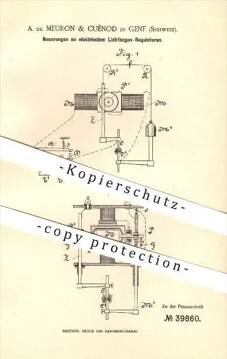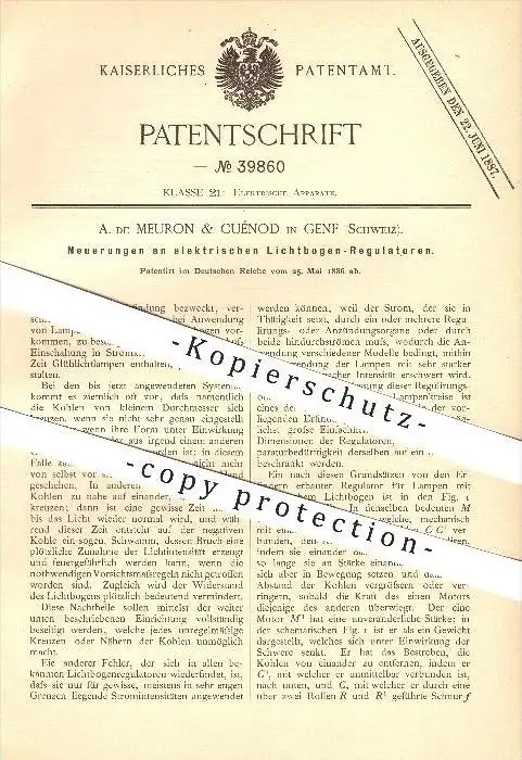 original Patent - A. de Meuron & Cuénod in Genf , 1886 , elektrischer Lichtbogen - Regulator , Lampe , Lampen , Licht !!