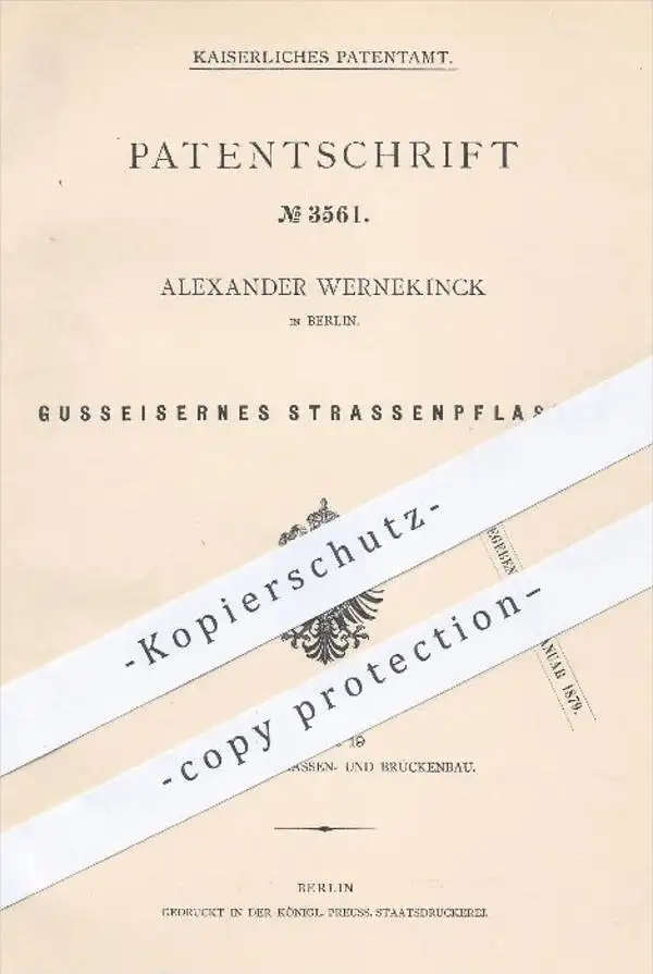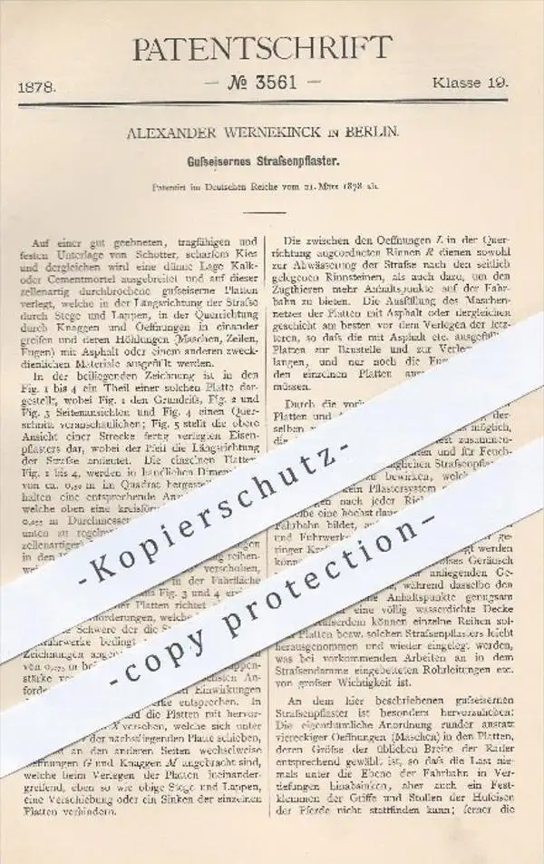original Patent - Alexander Wernekinck in Berlin , 1878 , Gusseisernes Straßenpflaster | Gusseisen , Straße , Straßenbau