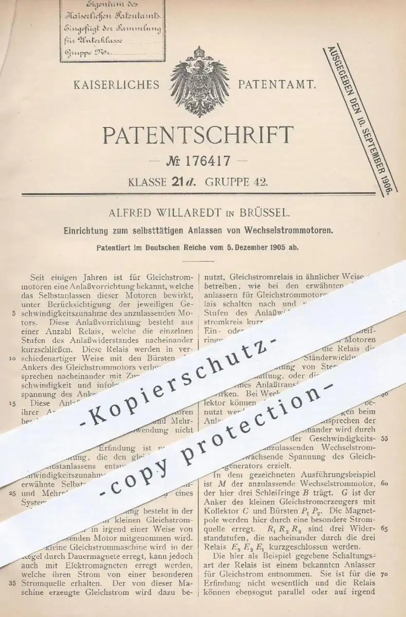 original Patent - Alfred Willaredt , Brüssel , 1905 , selbsttätiges Anlassen von Wechselstrommotoren | Motor , Motoren !