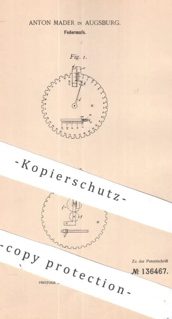 original Patent - Anton Mader , Augsburg | 1901 | Federmaß | Federmass | Messen von Durchmesser | Uhr , Uhren , Uhrwerk