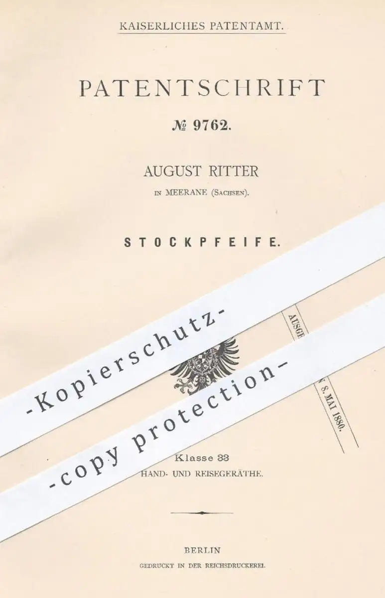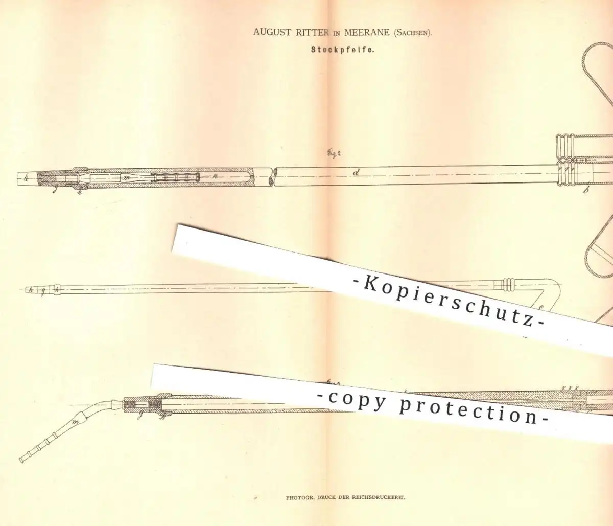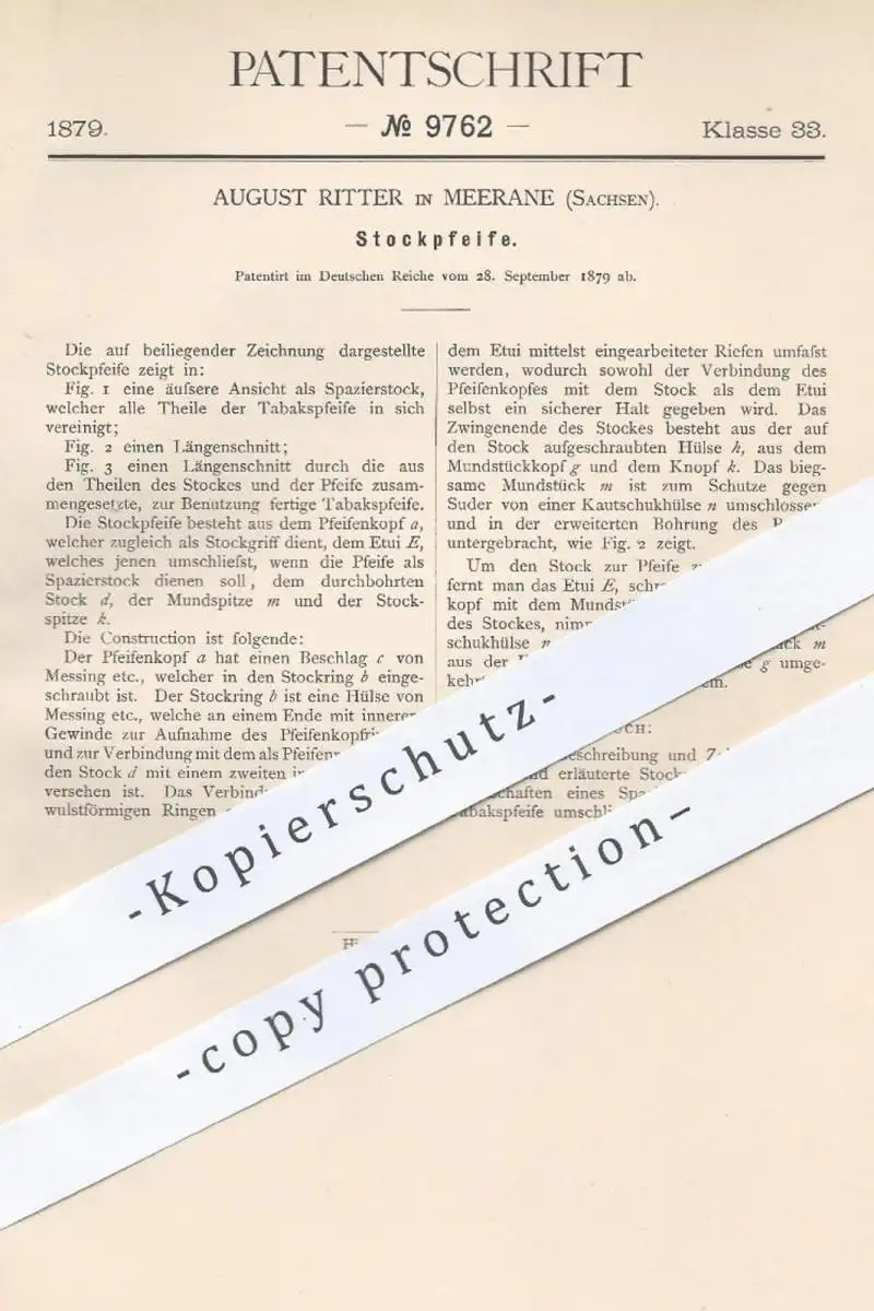 original Patent - August Ritter , Meerane Sachsen , 1879 , Stockpfeife | Pfeife , Tabak - Pfeifen , Spazierstock , Stock