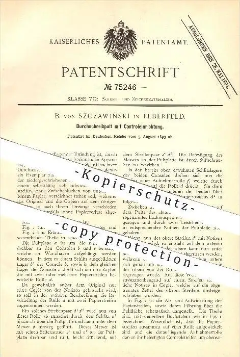 original Patent - B. von Szczawinski in Elberfeld , 1893 , Durchschreibpult mit Kontrolleinrichtung , Wuppertal !!!