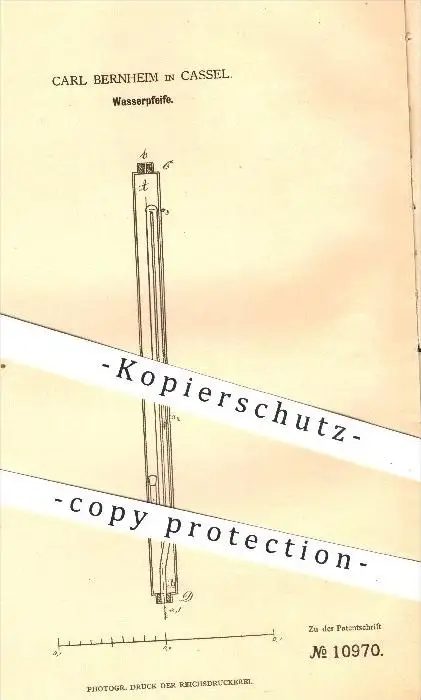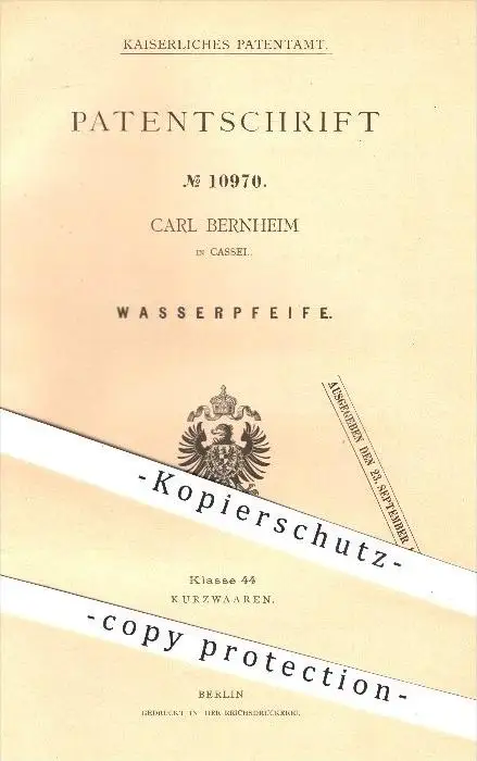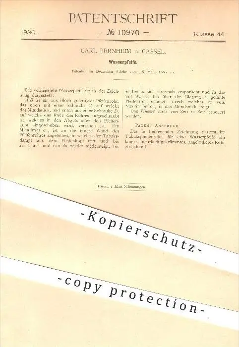 original Patent - C. Bernheim , Kassel , 1880 , Wasserpfeife , Pfeife , Pfeifen , Tabak , Rauchen , Wasser , Kurzwaren