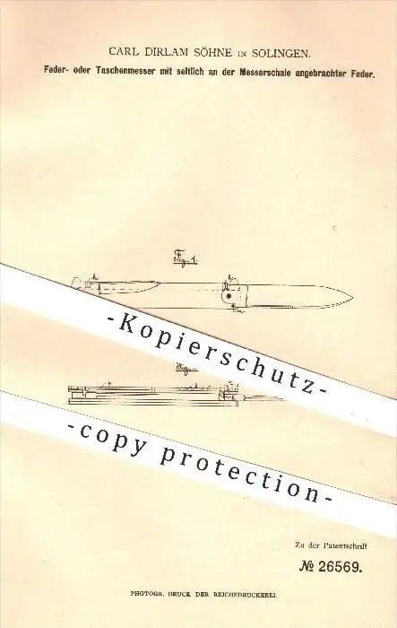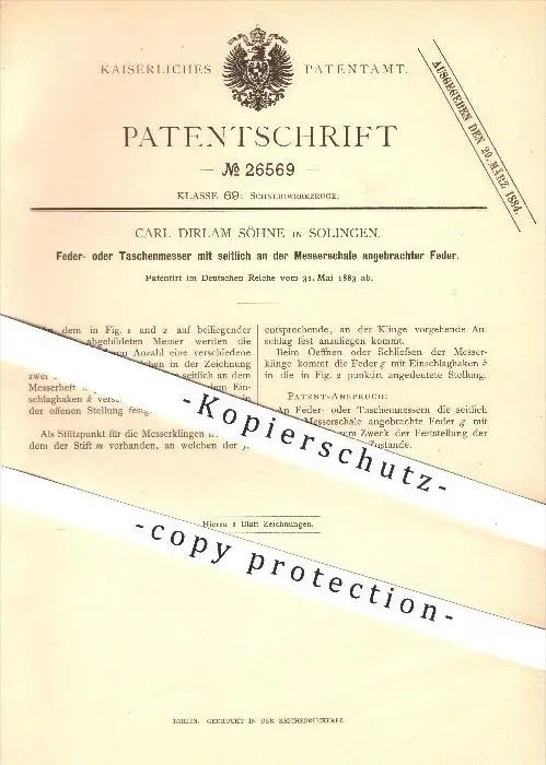 original Patent - Carl Dirlam Söhne in Solingen , 1883 , Feder- oder Taschenmesser mit seitlicher Feder , Messer !!!