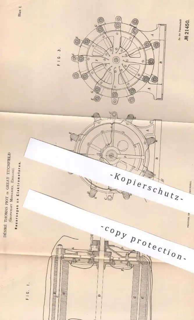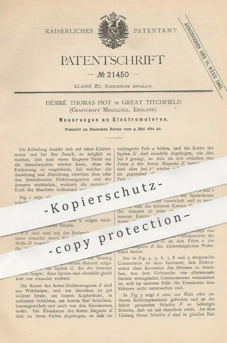 original Patent - Désiré Thomas Piot , Great Titchfield , Middlesex , England , 1882 , Elektromotor | Motor , Motoren !
