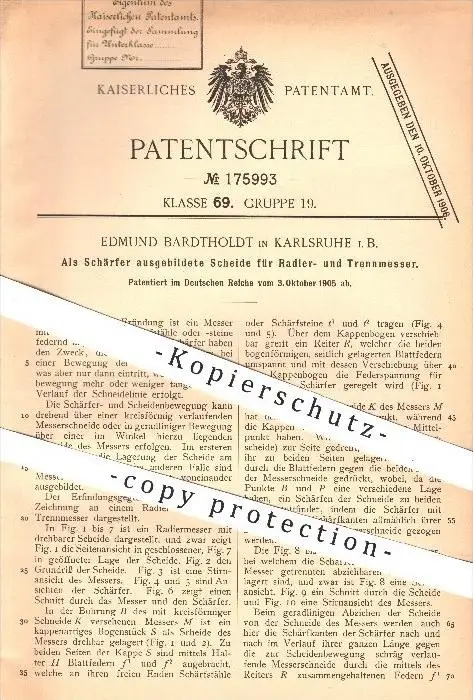 original Patent - E. Bardtholdt , Karlsruhe , 1905 , Schärfer u. Scheide für Radier- u. Trennmesser , Messer , Klinge !!