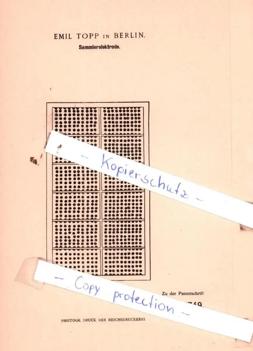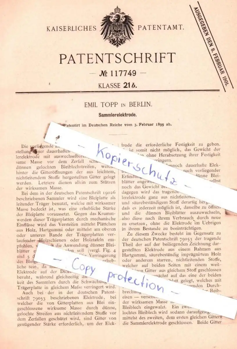 original Patent - Emil Topp in Berlin , 1899 , Sammlerelektrode !!!