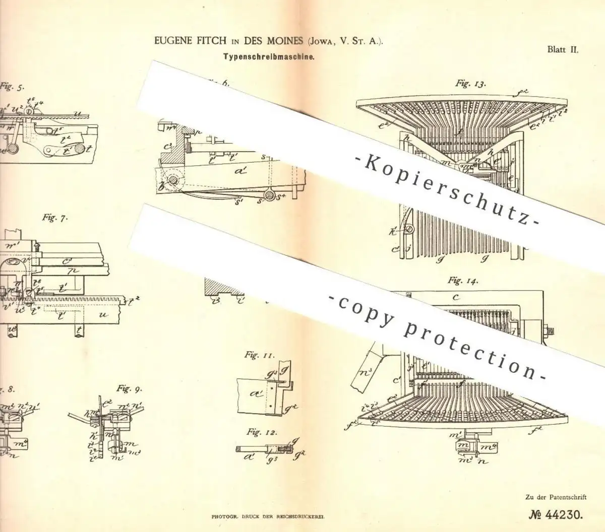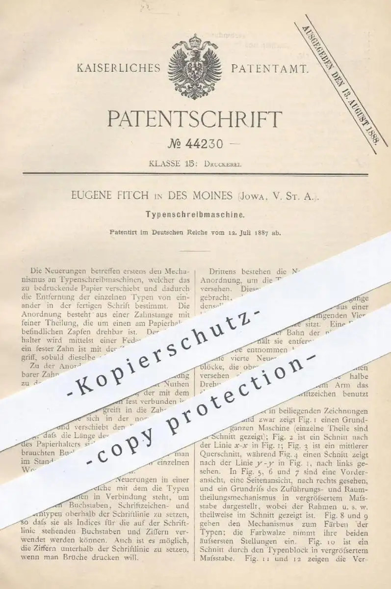 original Patent - Eugene Fitch in des Moines , Jowa , USA , 1887 , Typenschreibmaschine | Schreibmaschine , Druck !!