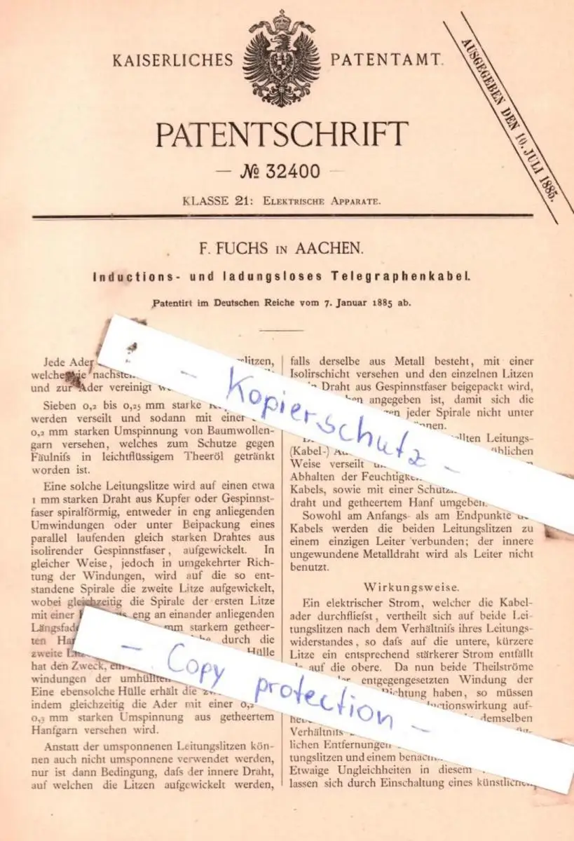 original Patent - F. Fuchs in Aachen , 1885 , Inductions- und ladungsloses Telegraphenkabel !!!