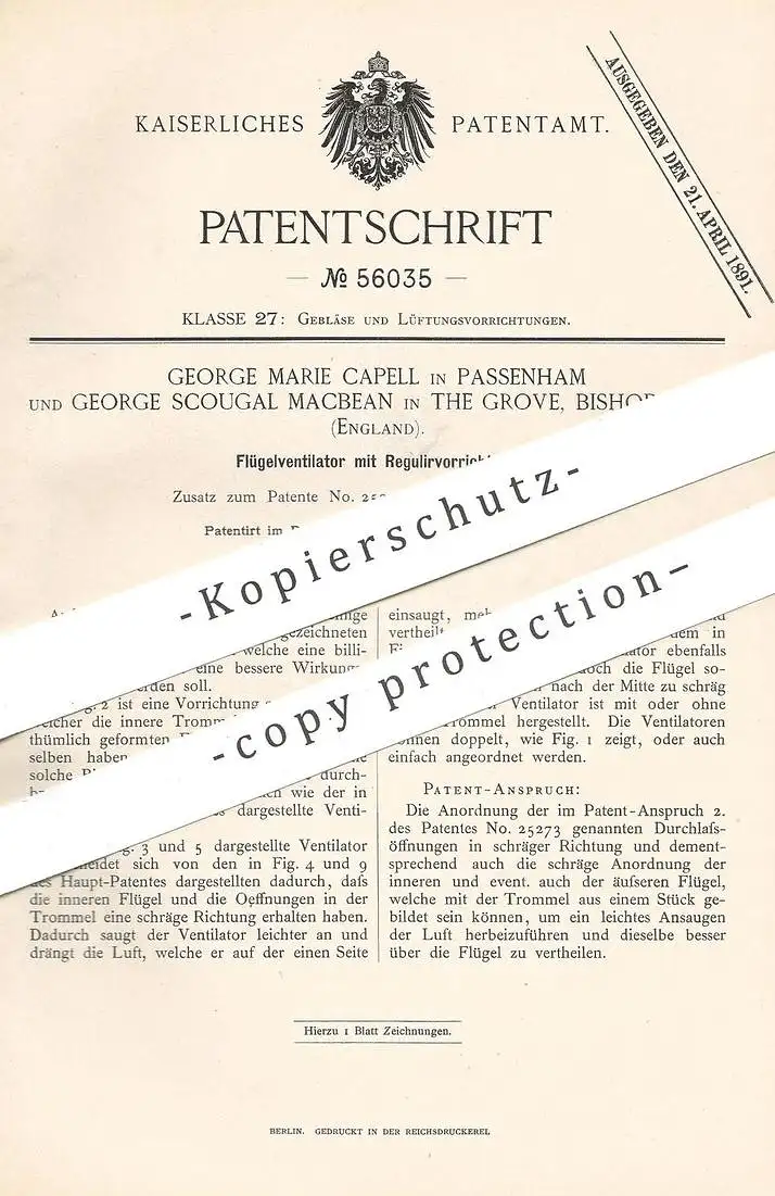 original Patent - George Marie Capell , Passenham | George Scougal Macbean , Grove , Bishopstoke , England | Ventilator