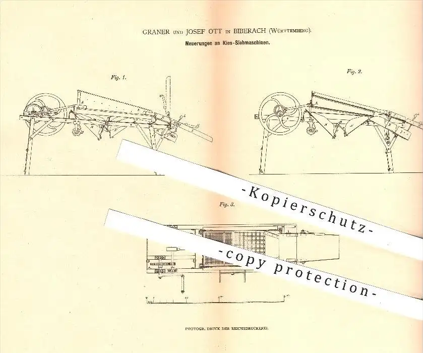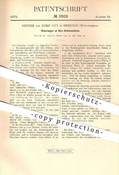original Patent - Graner und Josef Ott in Biberach , 1879 , Kies - Siebmaschinen , Sieben , Straßenbau , Bau !!!