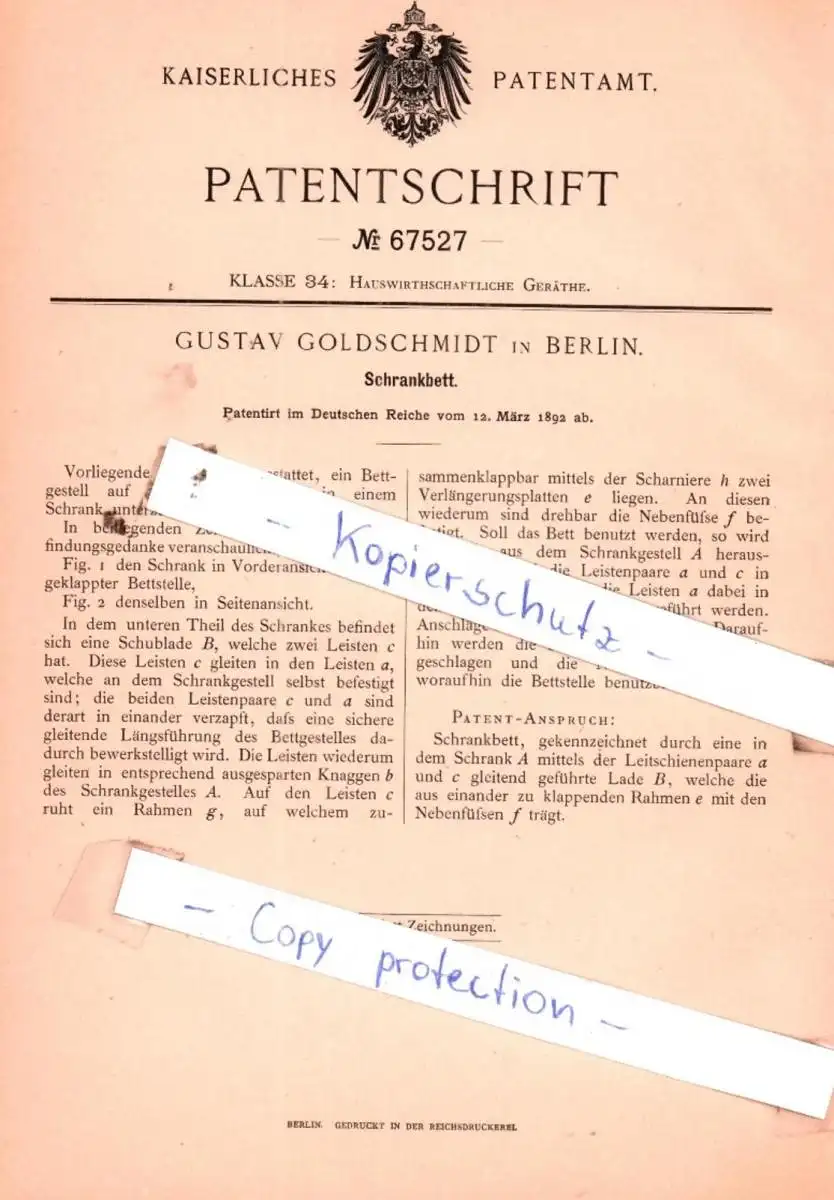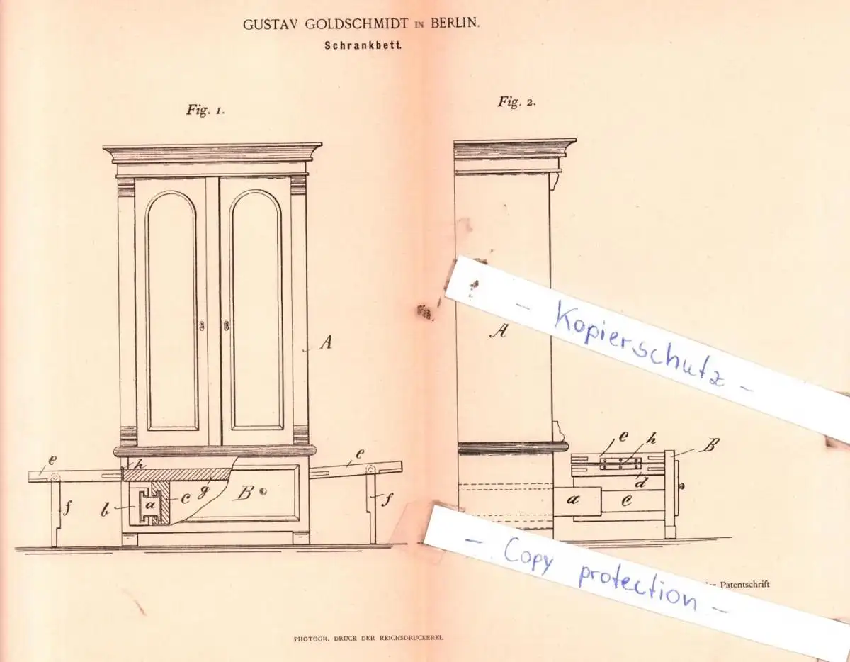 original Patent - Gustav Goldschmidt in Berlin , 1892 , Schrankbett !!!