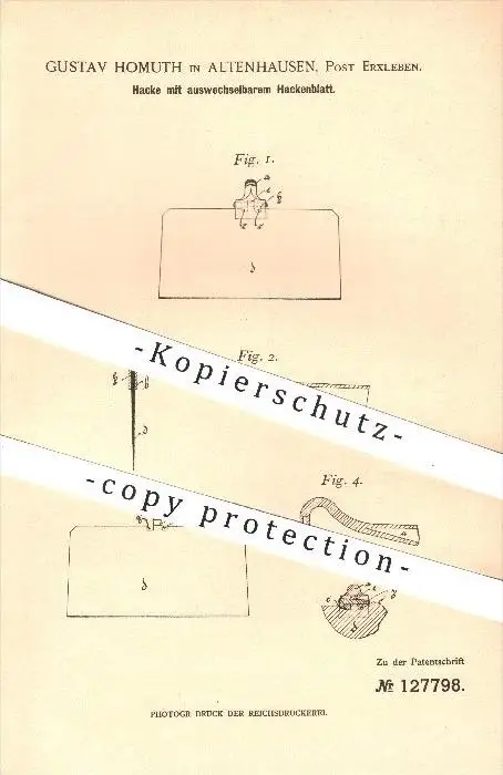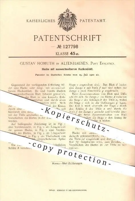 original Patent - Gustav Homuth , Altenhausen , Post Erxleben , 1900 , Hacke mit auswechselbarem Hackenblatt , Hacken !!