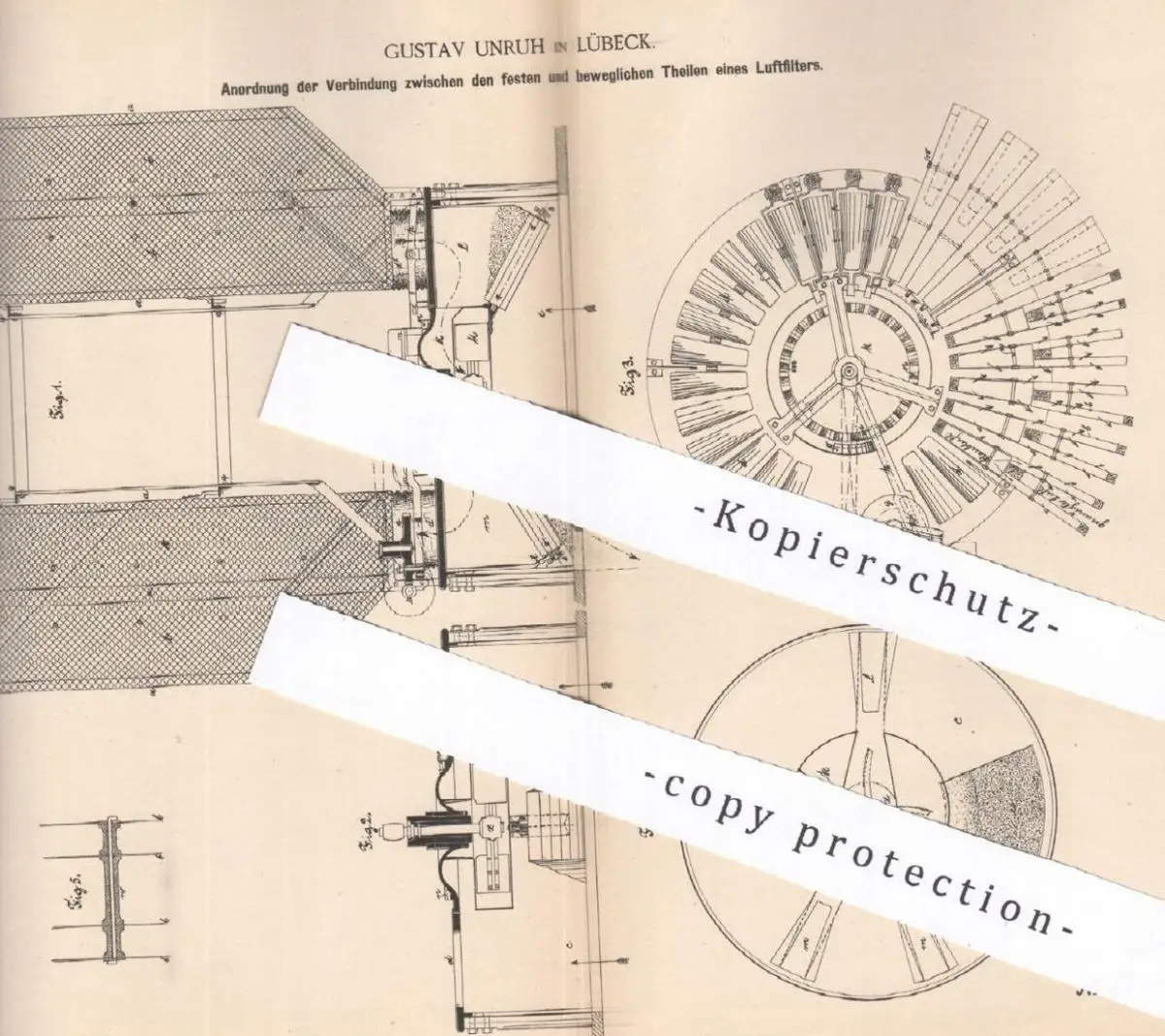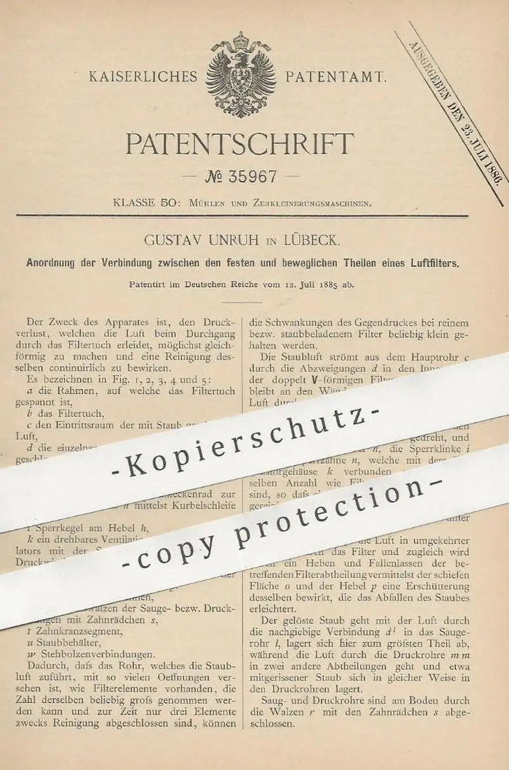 original Patent - Gustav Unruh , Lübeck , 1885 , Verbindung der Luftfilter - Teile | Mühle , Mühlen , Filter , Filtern