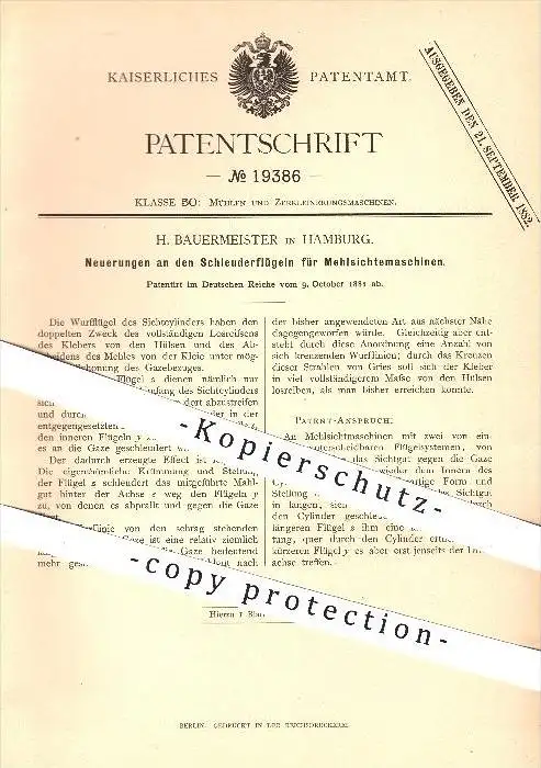 original Patent - H. Bauermeister in Hamburg , 1881 , Schleuderflügel an Mehlsichtemaschinen , Mühle , Mühlen , Müller