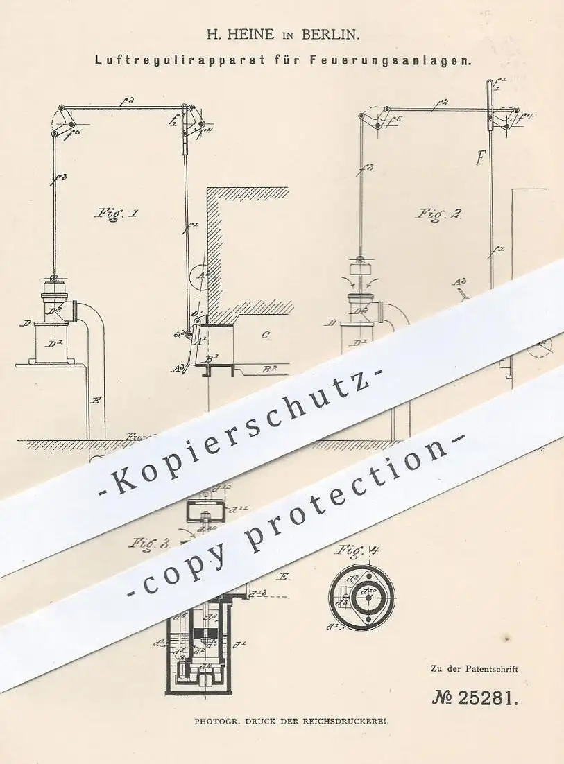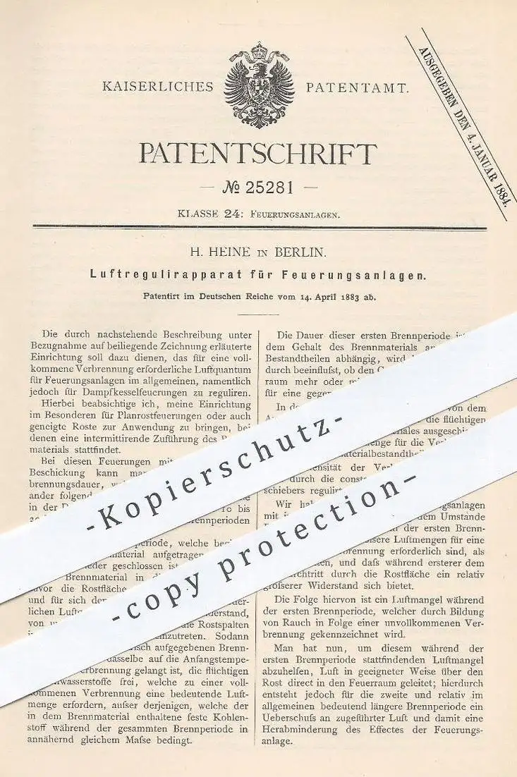 original Patent - H. Heine , Berlin , 1883 , Luftregulierung an Feuerungsanlagen | Feuerung , Lüftung , Ofen , Ofenbauer