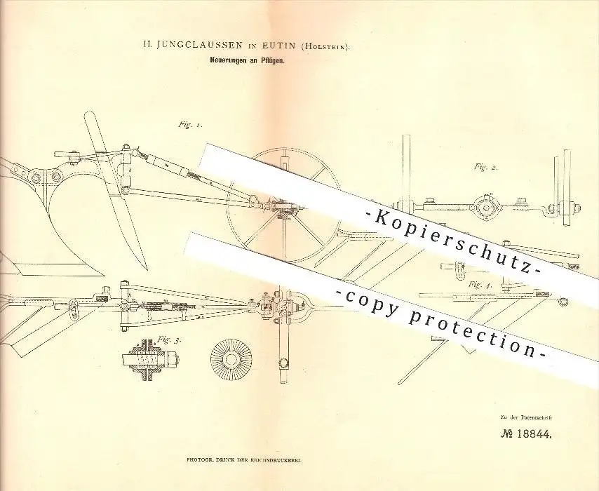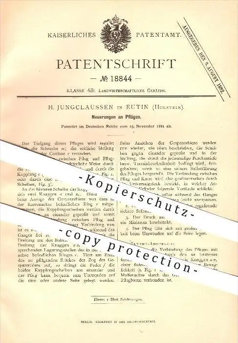 original Patent - H. Jungclaussen in Eutin , 1881 , Pflug , Pflügen , Landwirtschaft , Ackerbau !!!