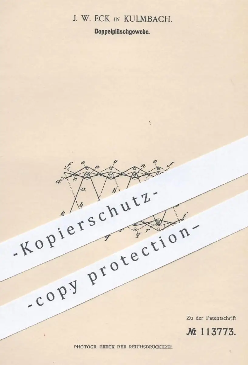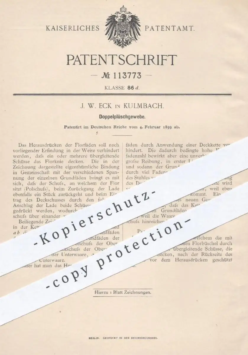 original Patent - J. W. Eck , Kulmbach , 1899 , Doppelplüschgewebe | Plüsch , Flor , Gewebe , Stoff , Webstuhl , Weben