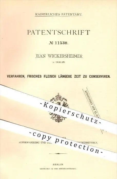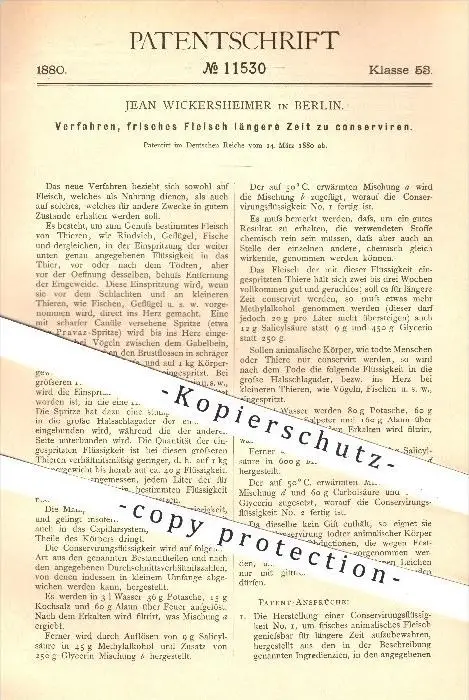 original Patent - Jean Wickersheimer in Berlin , 1880 , Verfahren , um frisches Fleisch längere Zeit zu konservieren !!!