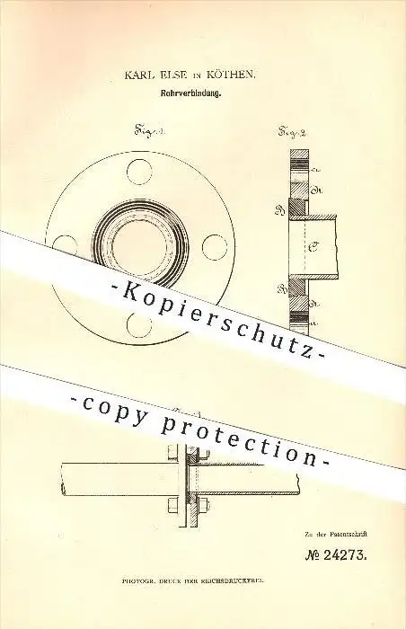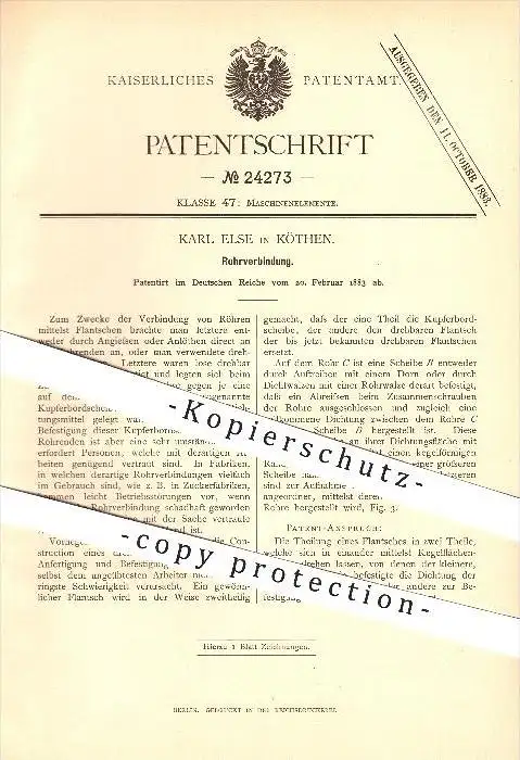 original Patent - Karl Else in Köthen , 1883 , Rohrverbindung , Rohr !!!
