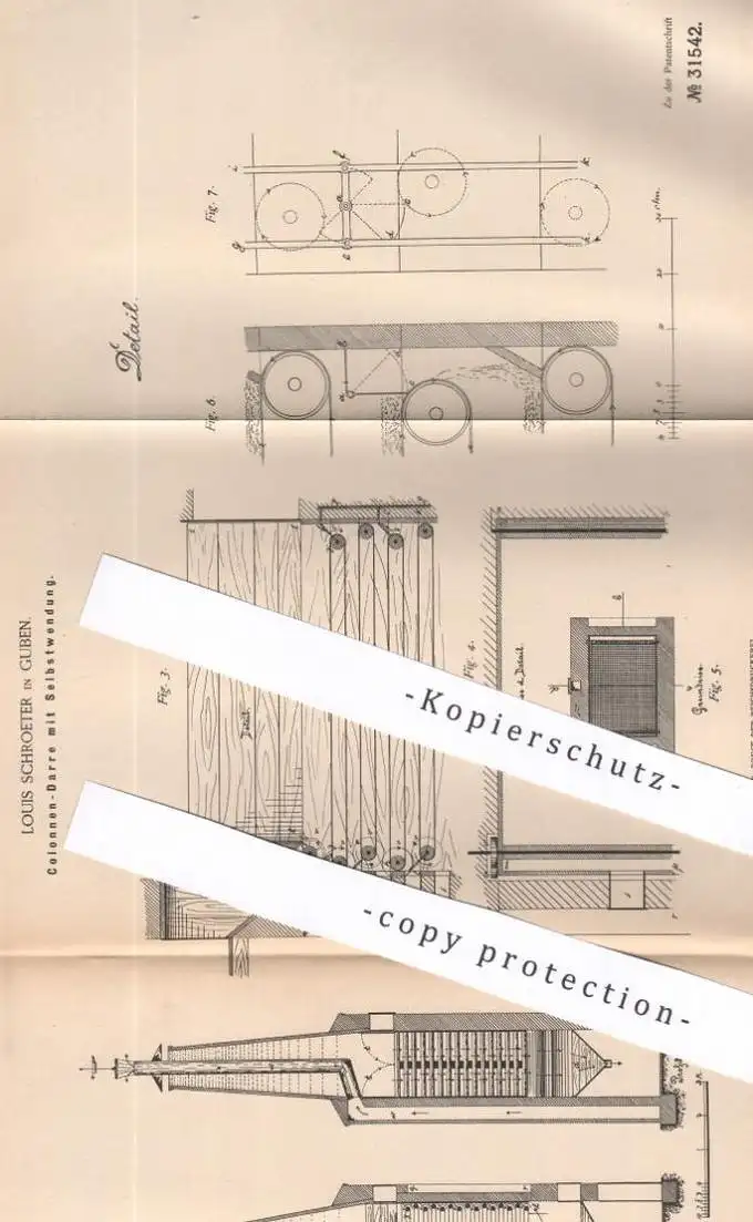 original Patent - Louis Schroeter , Guben , 1884 , Kolonnen - Darre mit Selbstwendung | Darren , Malz , Bier , Brauerei