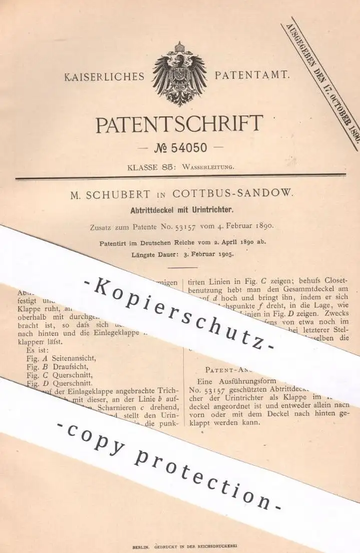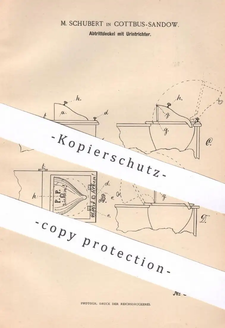 original Patent - M. Schubert , Cottbus / Sandow , 1890 , Abtrittdeckel mit Urintrichter | Kloset , WC , Toilette !!