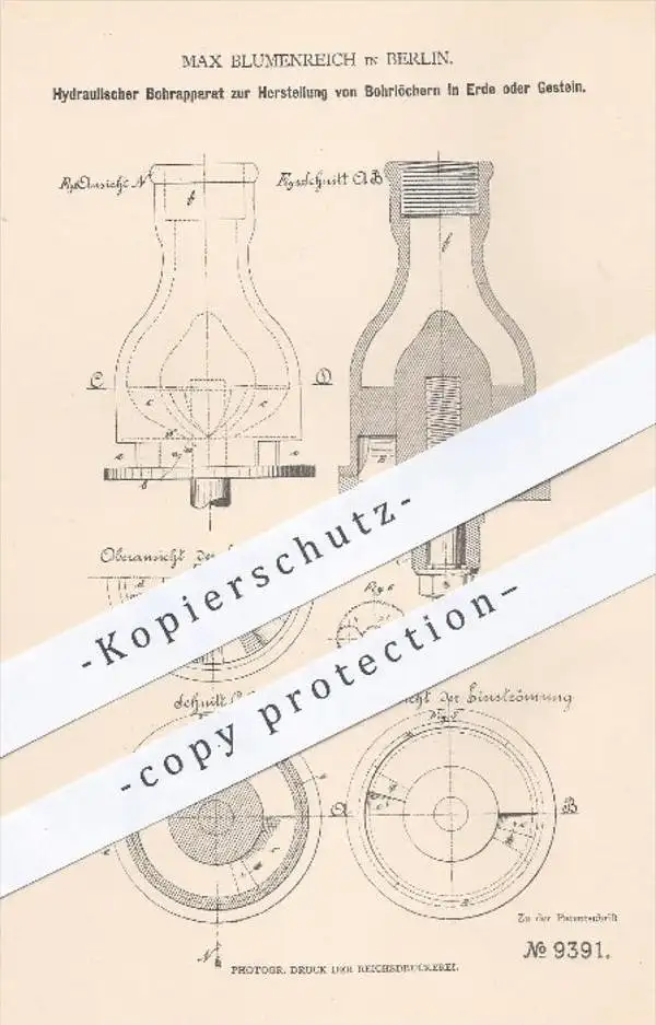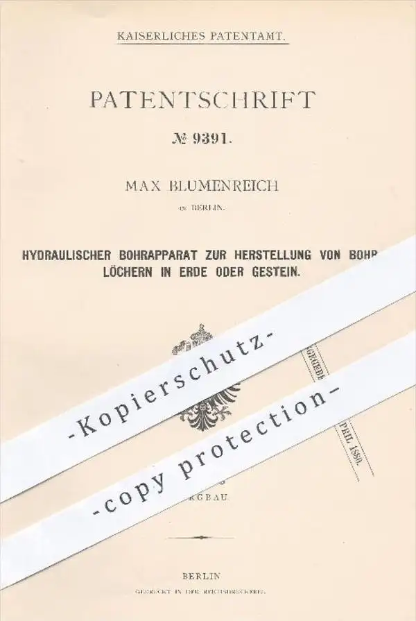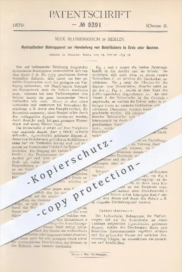 original Patent - Max Blumenreich , Berlin , 1879 , Hydraulischer Bohrer zum Bohren in Erde o. Gestein | Bergbau !!!