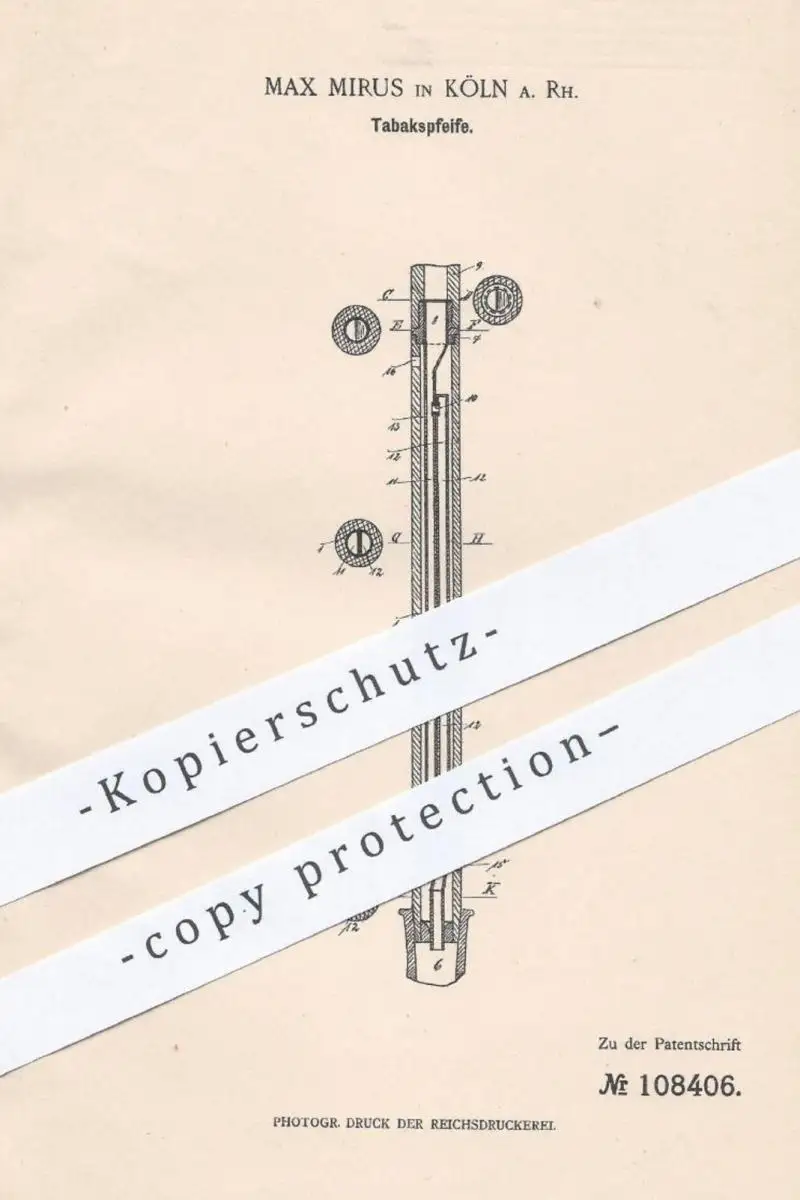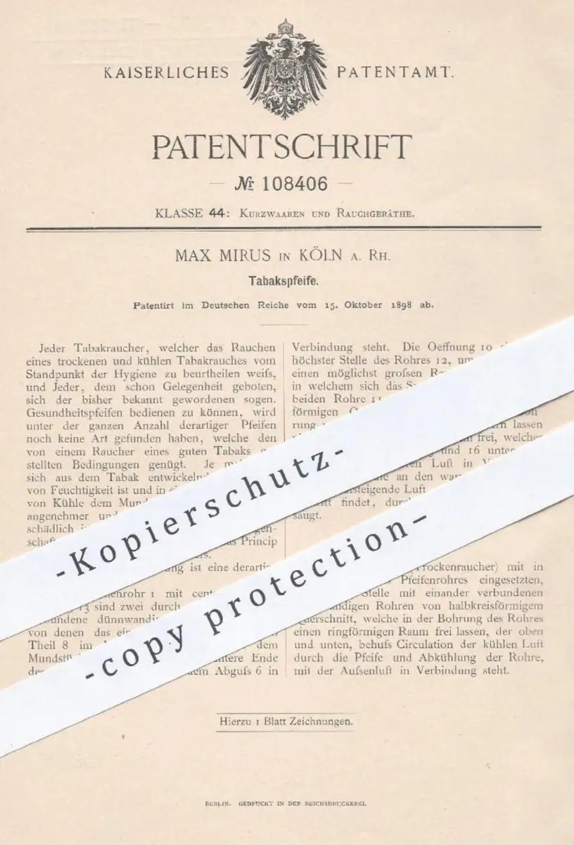 original Patent - Max Mirus , Köln / Rhein , 1898 , Tabakspfeife | Pfeife , Tabak , Rauchen , Zigarre , Pfeifen !!!