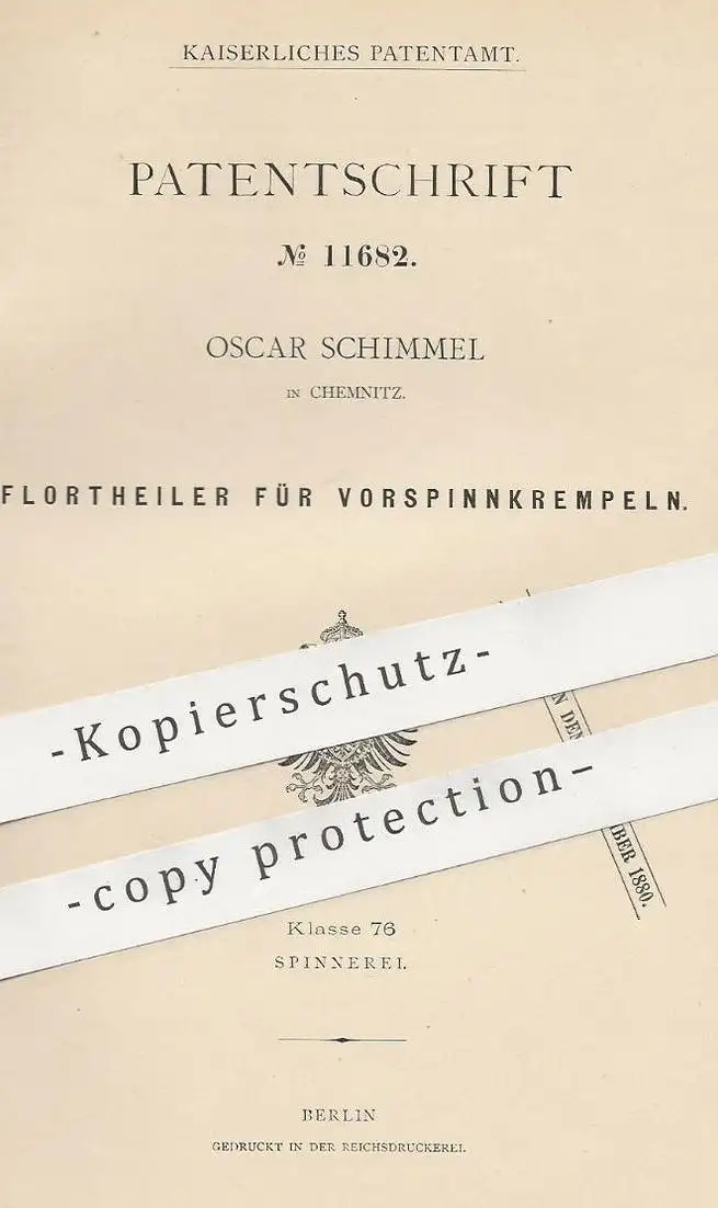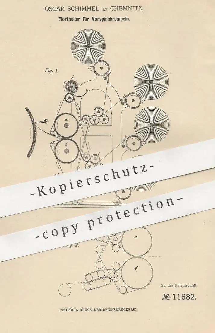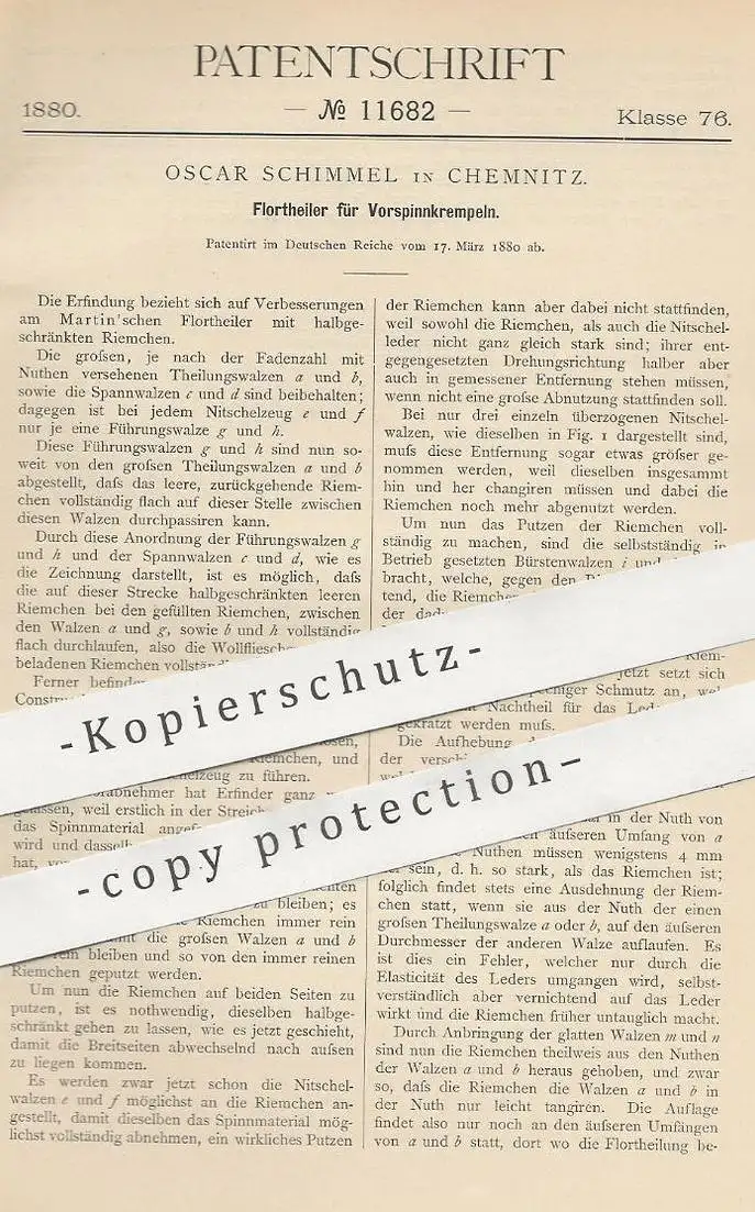 original Patent - Oscar Schimmel , Chemnitz , 1880 , Flortheiler für Vorspinnkrempeln | Spinnmaschinen , Flor , Walzen