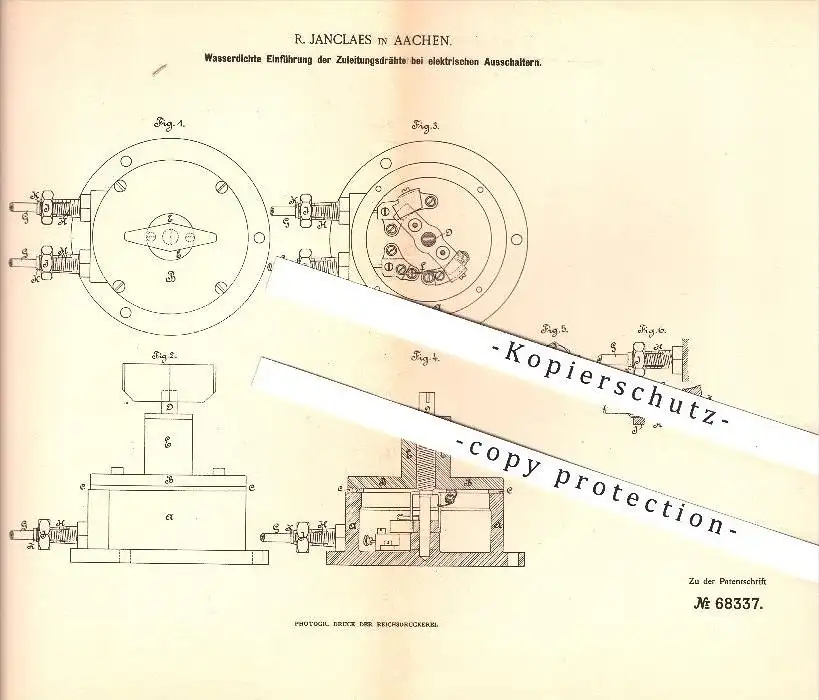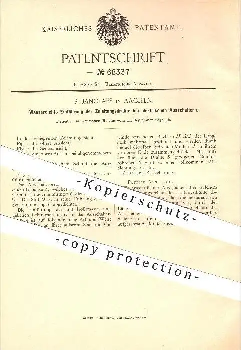 original Patent - R. Janclaes in Aachen , 1892 , elektrischer Ausschalter , Leitungen , Strom , Ströme , Elektrik !!!