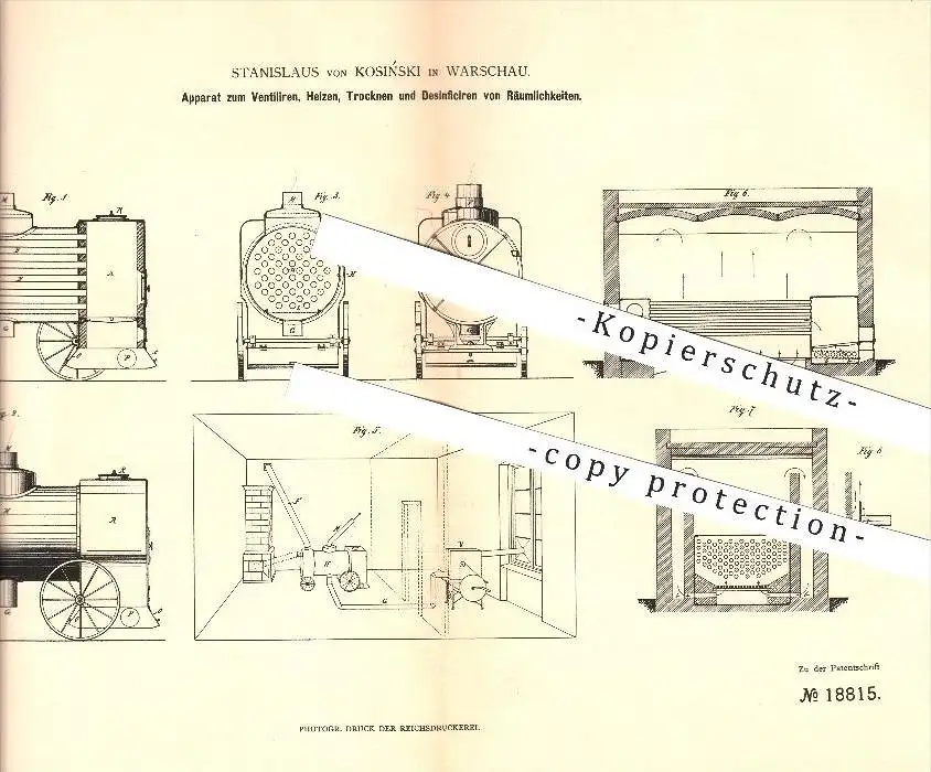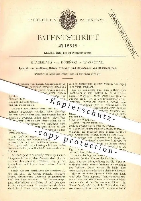 original Patent - Stanislaus von Kosinski in Warschau , 1881 , Ventilieren, Heizen, Trocknen u. Desinfizieren von Räumen