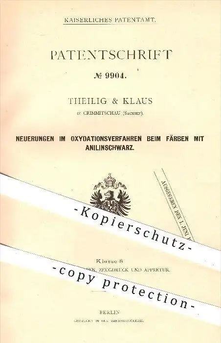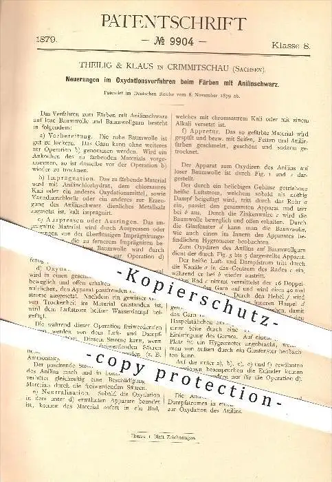 original Patent - Theilig & Klaus in Crimmitschau , 1879 , Oxidationsverfahren beim Färben mit Anilinschwarz , Schwarz