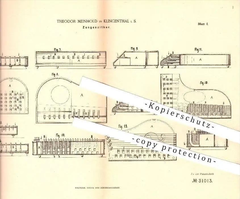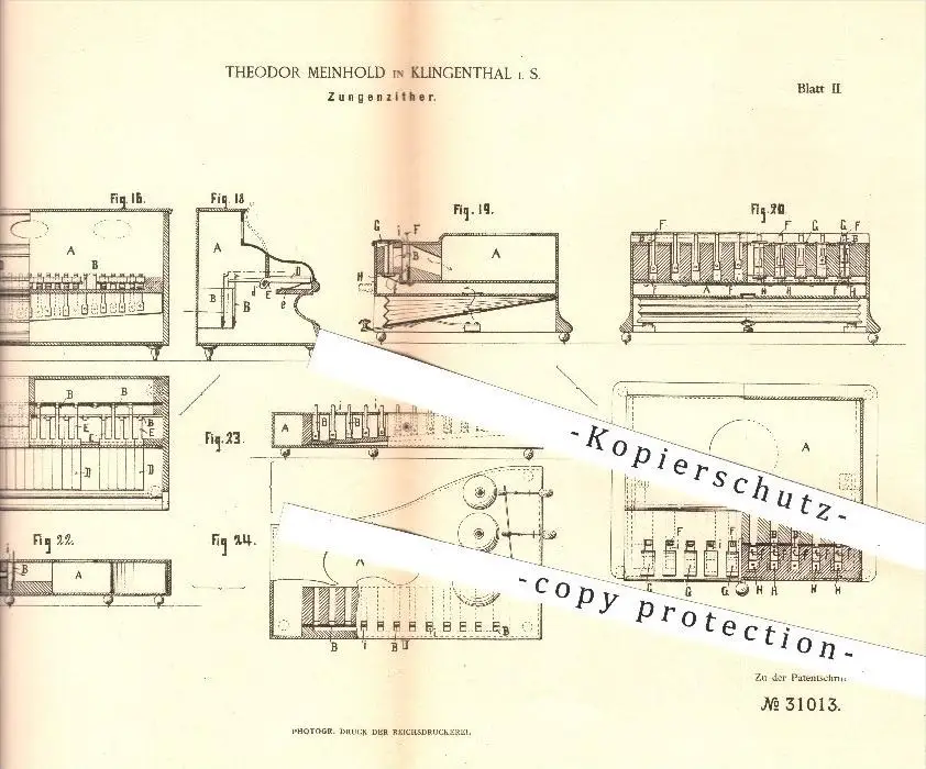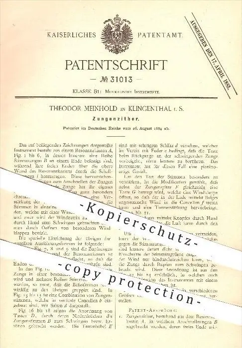 original Patent - Theodor Meinhold in Klingenthal , 1884 , Zungenzitter , Zitter , Zittern , Musikinstrumente , Musik !