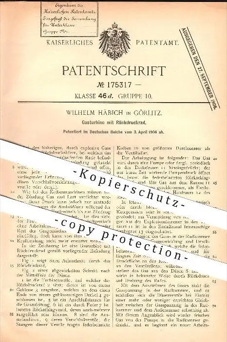 original Patent - Wilhelm Häbich in Görlitz , 1904 , Gasturbine mit Rückdruckrand !!!