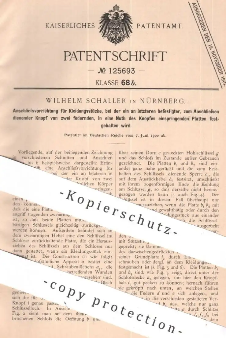 original Patent - Wilhelm Schaller , Nürnberg | 1900 | Anschließvorrichtung für Kleidungsstück | Verschluss für Kleidung