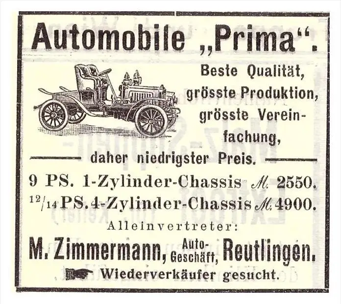 original Werbung - 1907 - Automobile PRIMA , M. Zimmermann in Reutlingen , automobile !!!