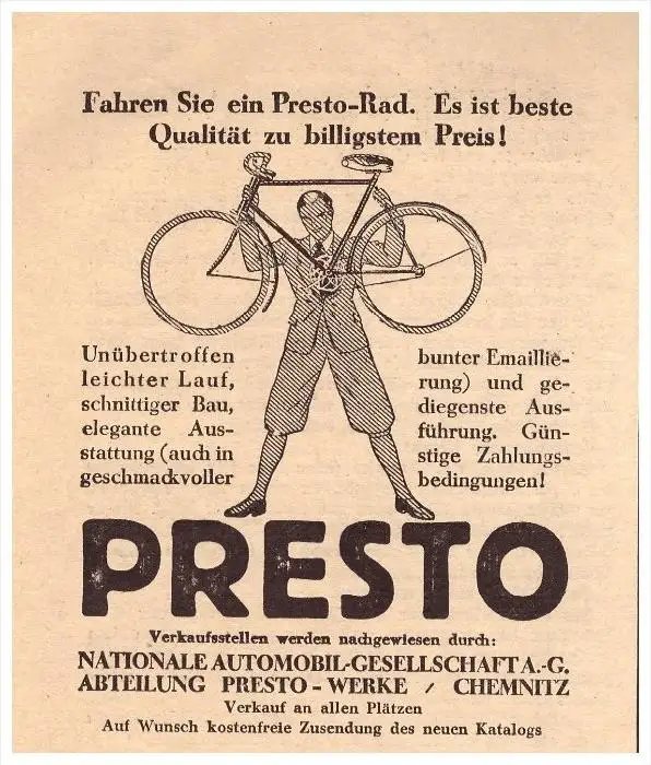 original Werbung - 1929 - PRESTO - Fahrrad , Nationale Automobil AG , Prestowerke Chemnitz !!!
