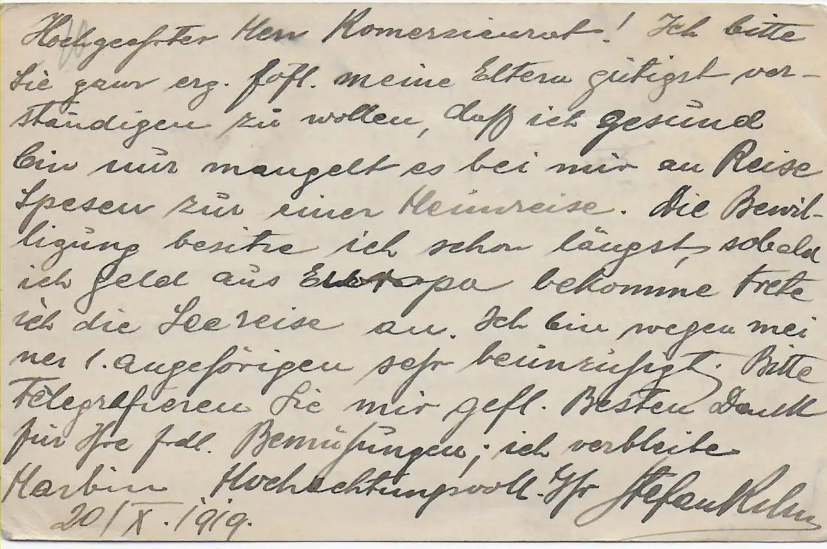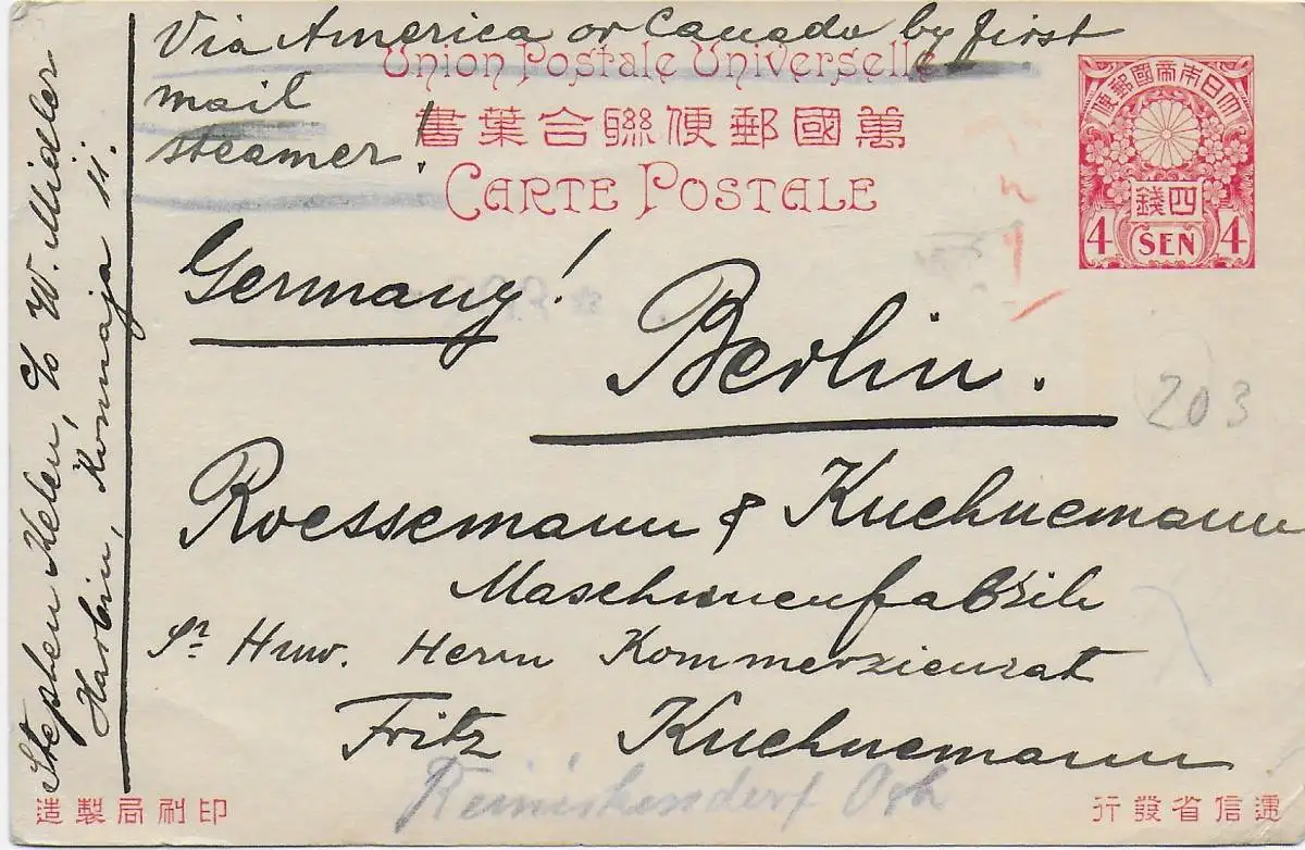 post card Harbin Konnaja via America or Canada to Berlin, 1919