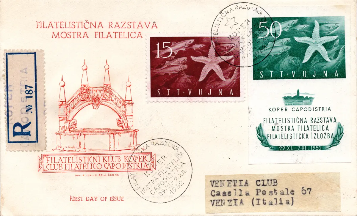 BEUTEL - Triest B - Ausstellung von Koper Nr. 71 + Zettel Nr. 3 auf Umschlag Racc. direkt an den Venetia Club - auf der Rückseite Zusatzfrankatur P.O. n. 35B + P.A. Nr. 3 - Selten Cod.542/182