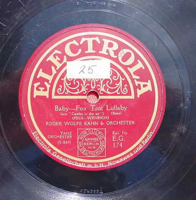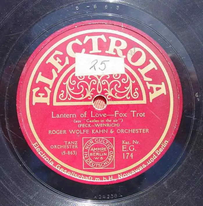 (2002367) Roger Wolfe Kahn & Orchester. FoxTrot. Alte Schellack-Schallplatte. Siehe bitte Beschreibung u. Bilder Roger Wolfe Kahn & Orchester. Titel A: 'Lantern of Love' Fox Trot. Titel B: 'Baby - Fox Trot Lullaby'. Foxtrot. Auf alter Schellack-Schallplatte Electrola Gesellschaft Nowawes und Berlin (Nr. E. G. 174). Durchmesser ca. 25 cm. Alle angebotenen Schellack-Schallplatten sind mehr oder weniger gebraucht. Zum Teil auch mit starken Gebrauchsspuren. Auch können sie etwas verschmutzt sein. Die Platten sind nicht probeabgespielt. Die Schellack-Platten sind Originale der damaligen Zeit und sind auch sehr beliebt nur als Nostalgieobjekt. Somit ist dieses Angebot vermutlich für jene Sammler nicht geeignet, die besonderen Wert legen auf exzellenten Zustand sowie auf einwandfreie Musikwiedergabe