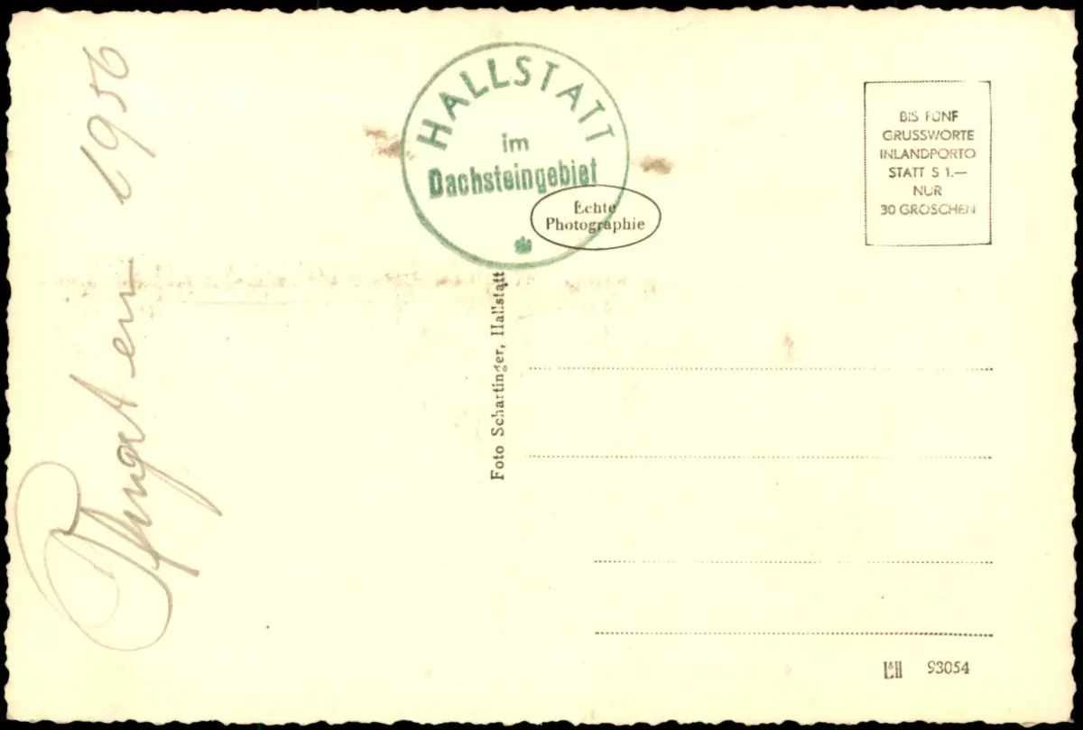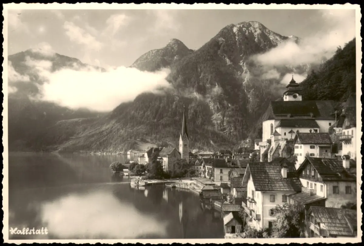 Ansichtskarte Hallstatt Stadtpartie Berge Wolken Fotokarte 1930