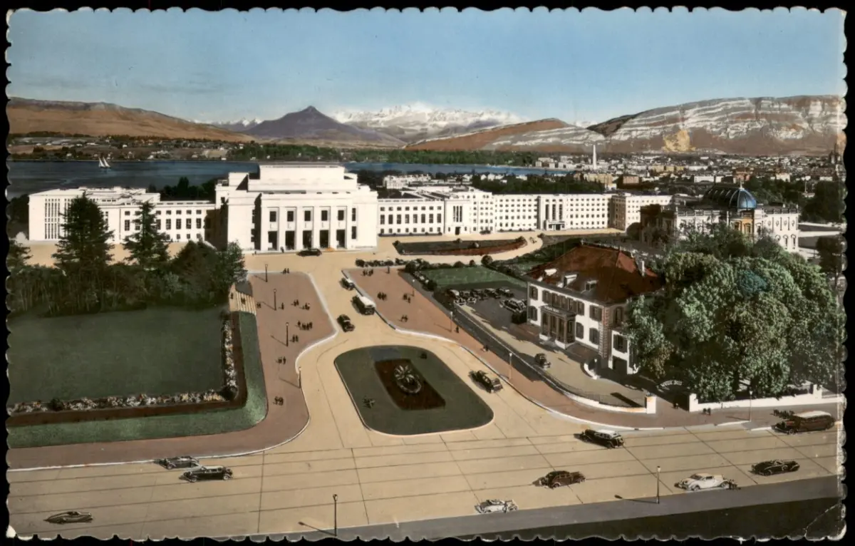 Genf Genève Le Palais des Nations,vue sur la ville et le Mont-Blanc 1962