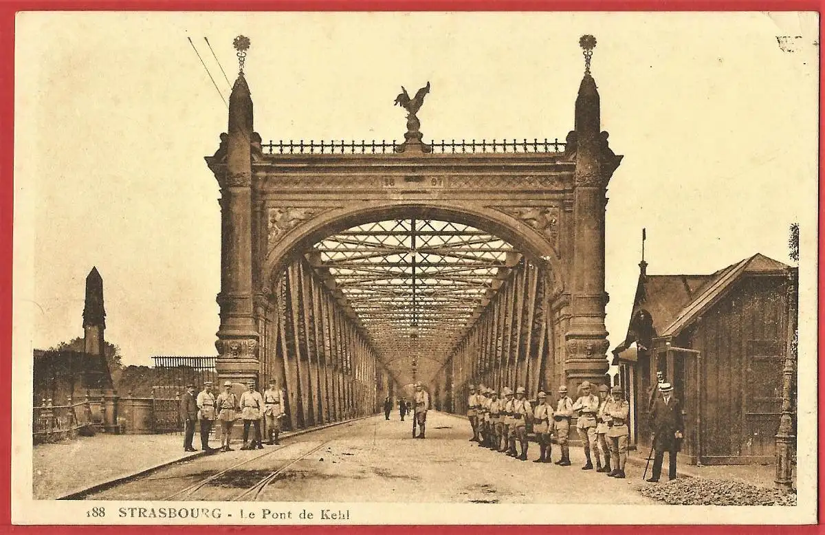 Motiv: Strasbourg : Le pont de Kekl, avec des militaires. Verlagsangaben: Cie des Arts Photomécaniques, 188.