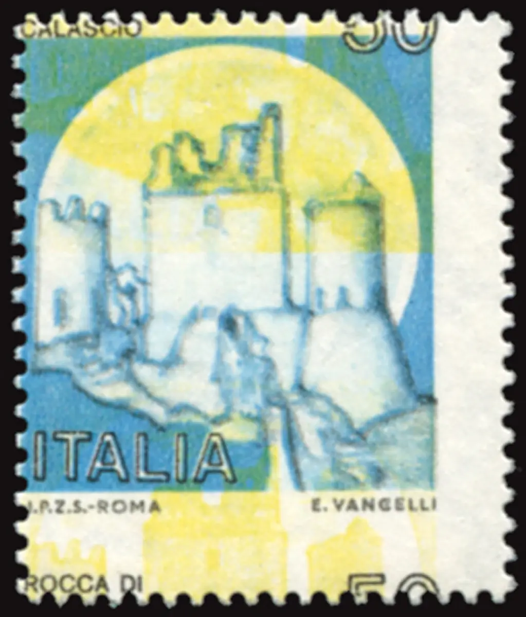 MNH Vollgummi - Castelli Lire 50 Nr. 1508 ohne Rotdruck, mit stark vertikal verschobenem Gelbdruck und Verzahnung - auffällig und ungewöhnlich Cod. 558/16