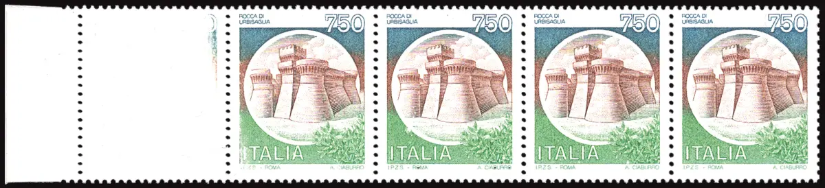 MNH - Vollgummi - - Castelli Lire 750 Nr. 1524A waagerechter Zehnerstreifen mit dem ersten Albino-gedruckten Exemplar - wirkungsvolle Vielfalt und Seltenheit Cod.732/182