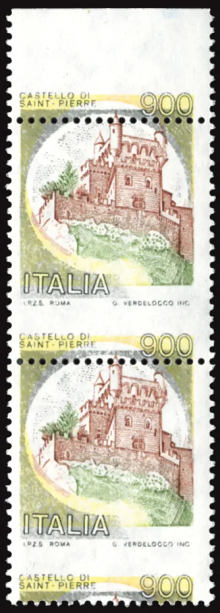 Castelli Lire 900 Sorte Wert unten Vollgummi MNH - Castelli Lire 900 Nr. 1526 vertikales Paar b. von f. oben mit stark nach unten verschobener horizontaler Verzahnung; Schriftzug Castello Sant Pierre 900 unten statt oben, am Blattrand wiederholt (Sass. spec. Nr. 1144 Ea) - Selten - Kat. 400++ Cod. 654/16